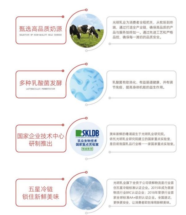 光明乳业始于1911年,百年国企老品牌,中国女排合作战略伙伴,被国家科技部评估为“优秀类国家重点实验室”,全球的“牧场千分”标准,从源头成就高品质。
